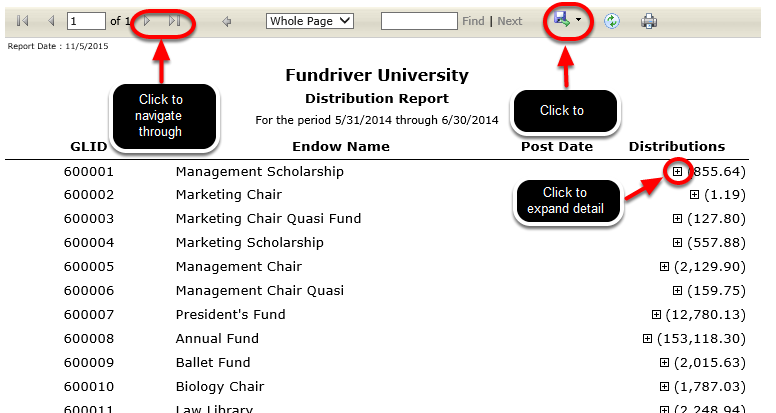 On the report, click the arrows to scroll through pages, search the report pages in the search bar, or click the disk icon to export to Word, Excel, or PDF.