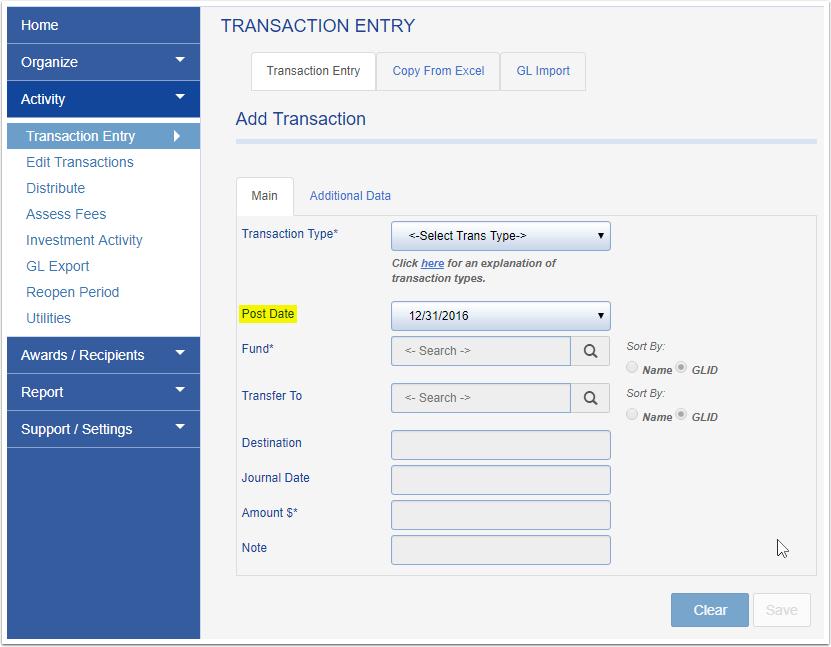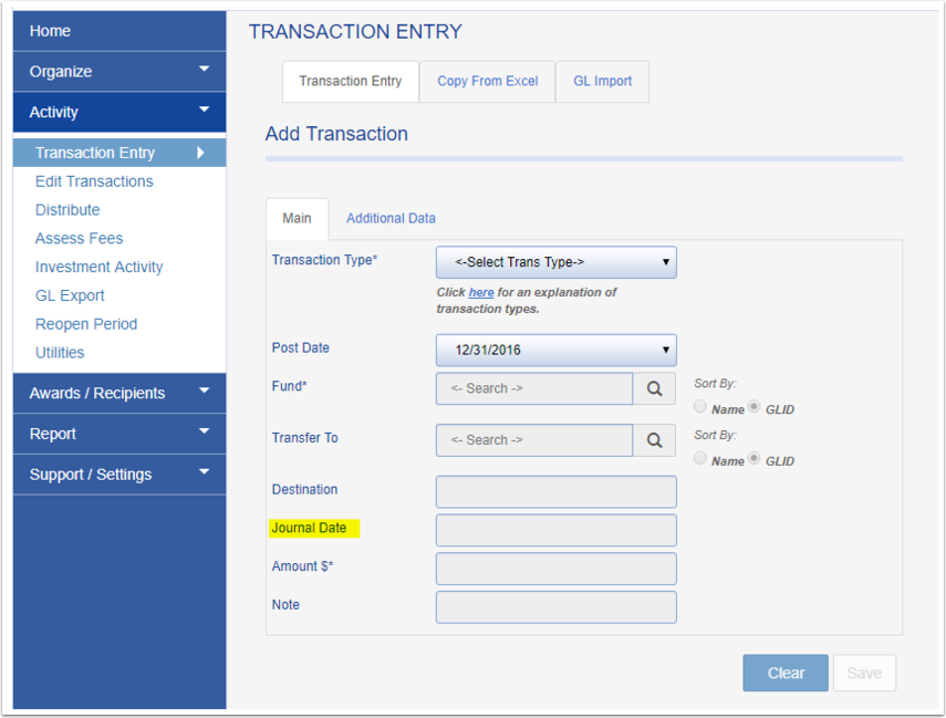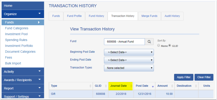 If you use Fundriver for automated distributions, whichever date you would choose to 'Use Fund Values As Of' would populate as a journal date on your transaction records.