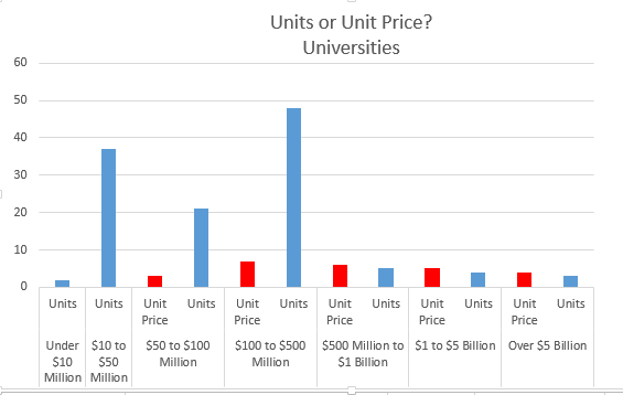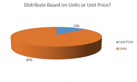 When an organization's endowments are unitized, there are two general approaches for handling distributions: 1) the distributions can impact the number of units or 2) the distributions can impact unit price. As you can see in the data below, which represents the practices of 204 current Fundriver clients, the size of the organization's endowment often plays a part in which method they choose. Very few client organizations with endowments lower than $100 million choose to have their distributions impact unit price. At the $500 million level, more institutions choose to have distributions impact unit price than impact units.