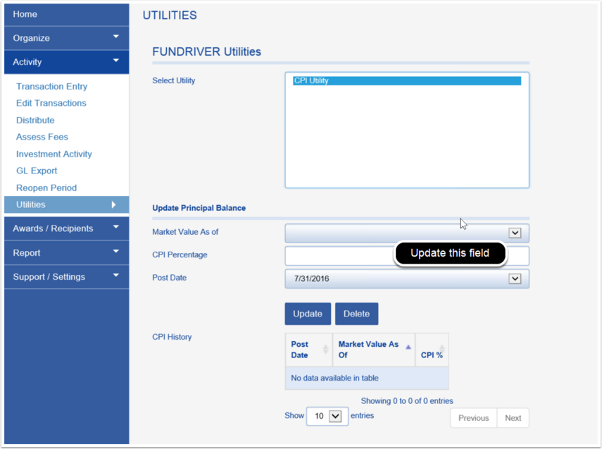 The Fundriver interface has a standard Consumer Price Index (CPI) Utility that can be configured to create automatic inflation adjustments. The inflation adjustments will impact funds corpus/historical gift values but will not impact market value or the cash reconciliation within Fundriver. This can be set up to apply to all funds or a subset of funds. Please note that if your organization has an underwater rule, this may limit funds from spending. Also, the inflation adjustment setting can be configured to be based on corpus or market values, the standard being market values. This article will explain how the inflation adjustment is created within Fundriver.