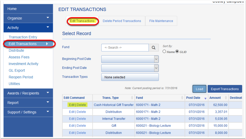 There are multiple ways to edit or delete transactions, depending on how they were entered into Fundriver. It is important to note that records can only be modified if they have not been posted. If you want to delete transactions in Prior Periods, you need to reopen to delete them and then reconcile the periods forward.