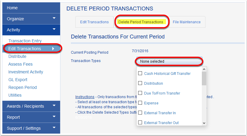 On the DELETE PERIOD TRANSACTIONS tab the user has the ability to select a specific transaction type and delete all associated transactions for the current posting period.