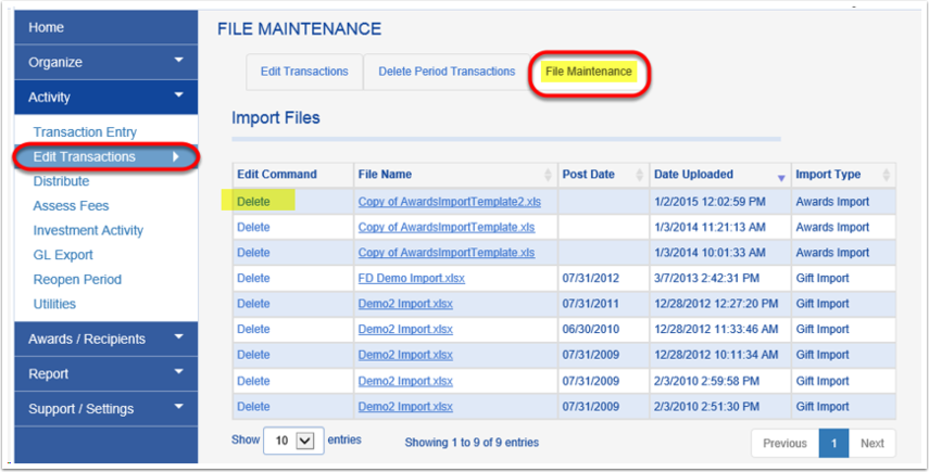 On the FILE MAINTENANCE tab the user has the ability to select a specific file and delete it completely. Deleting the file will delete all associated transactions (only in the current open period).