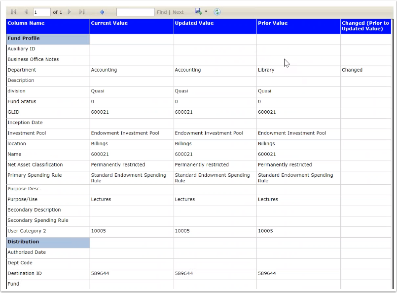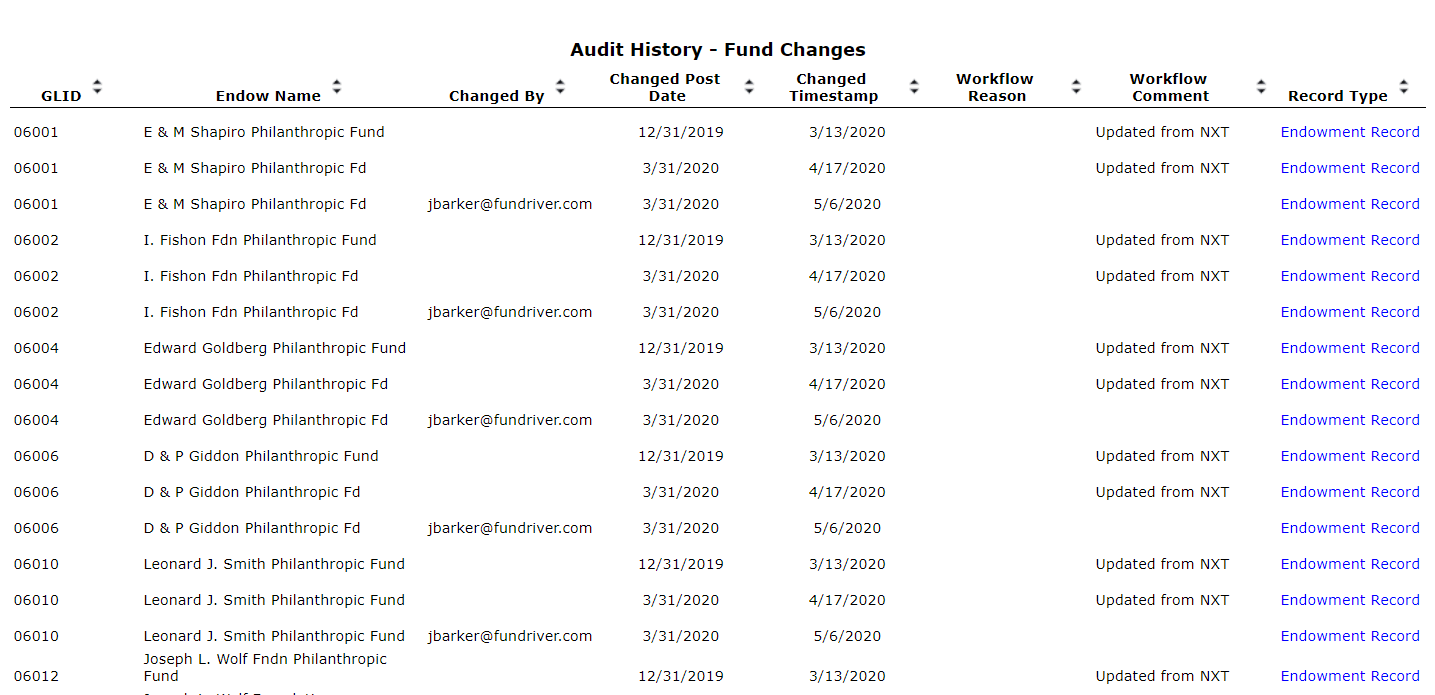 The Fund Changes report (found in Audit Log folder), shows changes made to any Fund Profile. This report can be sorted by any one of the report headings. In addition, the report shows whether changes were made through the NXT integration. This report also has a drill down feature that opens up a sub report showing specifically what changes were made on the Fund Profile.